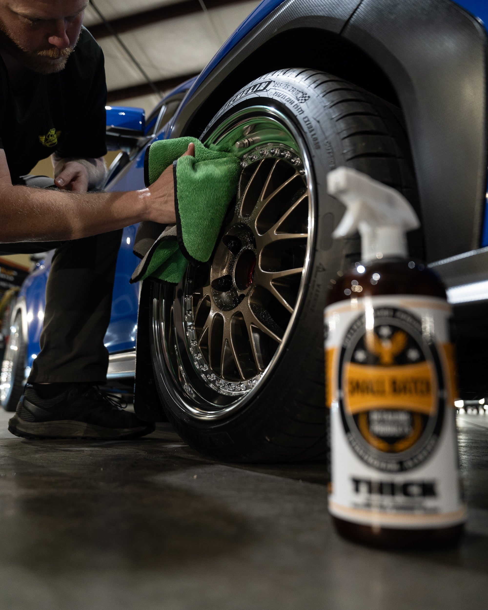 Spray a stout dose onto the face of the wheels and you'll notice the viscosity clings to the surface with minimal running. This allows you to gently clean the surface without chasing annoying runs & drips into every crevice. For best results we recommend using a fat plush microfiber towel to safely grab and lift the debris. Flip the towel to a clean side for the final wipe to remove any minor streaks. No need to follow up with a secondary product.